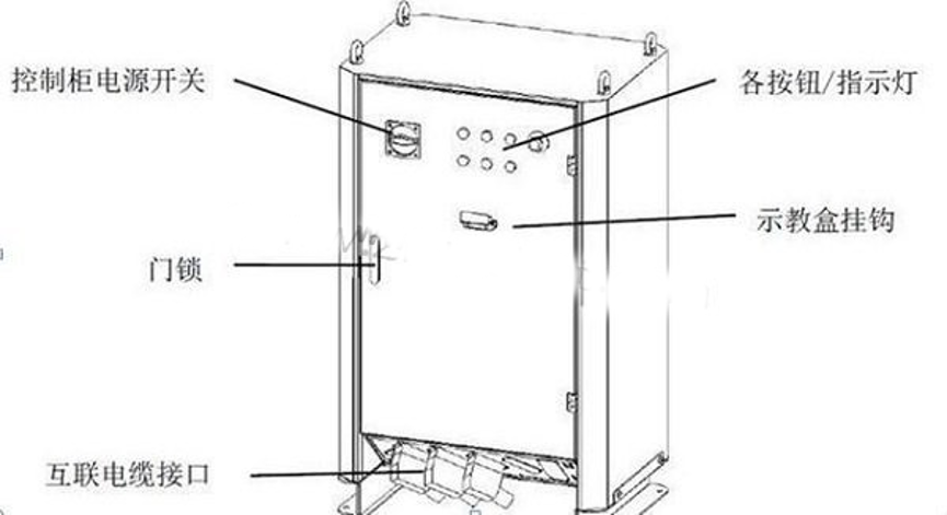 工業(yè)機(jī)器人控制柜,前面板上有控制柜電源開關(guān)、門鎖以及各按鈕/指示燈,示教盒懸掛在按鈕下方的掛鉤上,控制柜底部是互聯(lián)電纜接口,例如下圖供工業(yè)機(jī)器人控制柜示意圖: